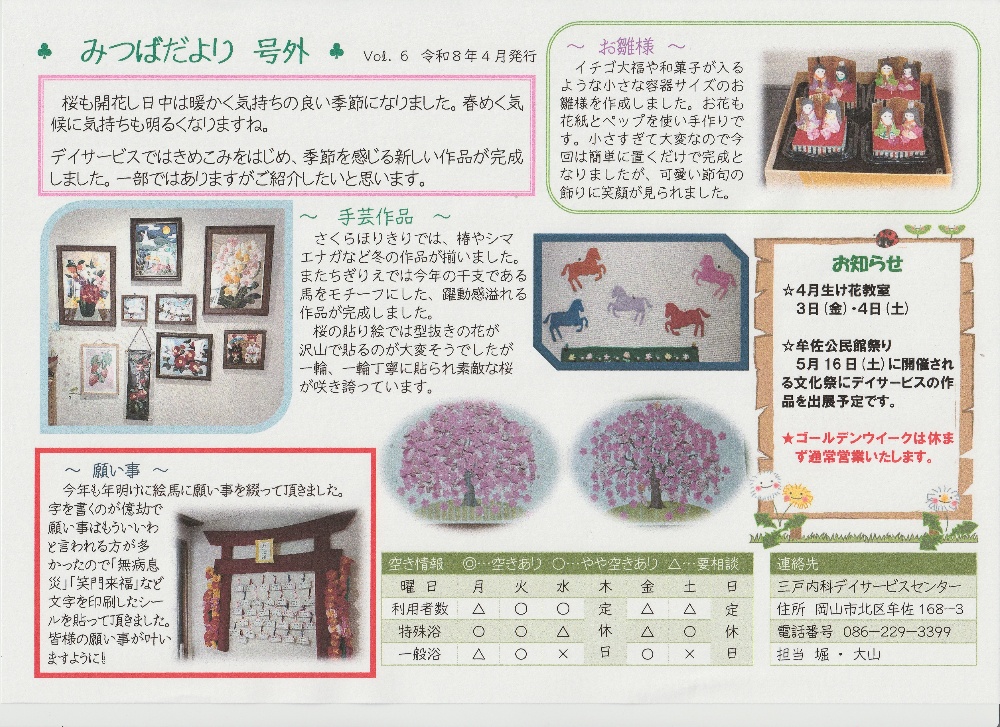 | 趣味活動 | ・パズルで頭の体操 ・牛乳パック細工 ・クレーアート(粘土細工) ・さくらほりきり(下記参照) ・音楽鑑賞 |